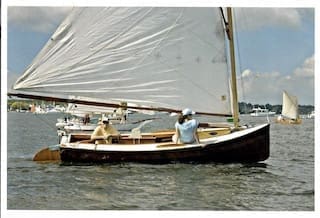 Phil Bolger describes it this way: “I designed Brad Story a catboat that can be rowed fast and far, relatively speaking, and incidentally produced one that doesn’t need as big a sail plan as the usual hard-bilged Cape model; she’s more on the New York model, the kind that developed into the sandbaggers. I call this a really sweet model, fair and easy, no great problems to frame and plank.” Perfect for cold-molding which was a new technique at the time.